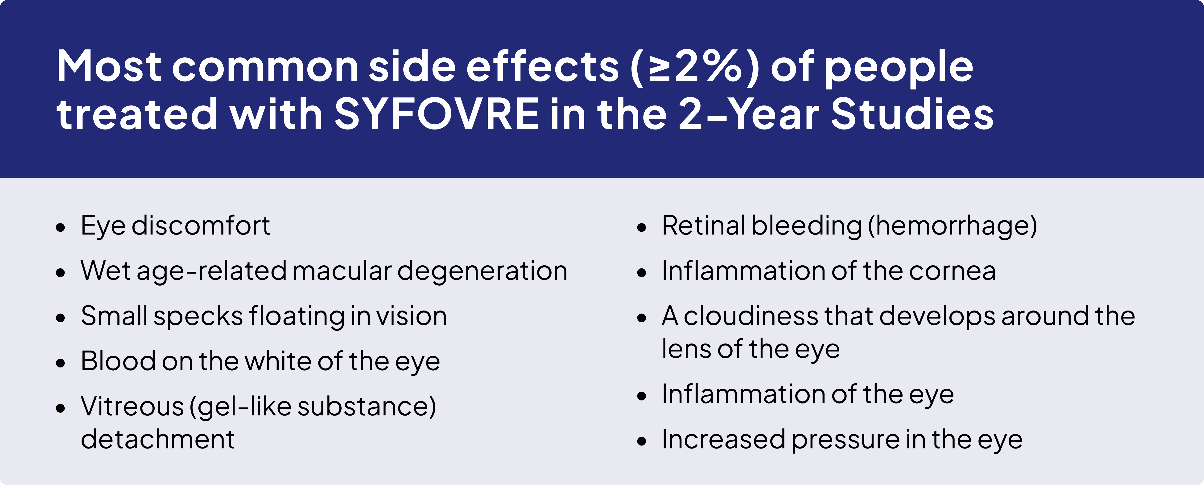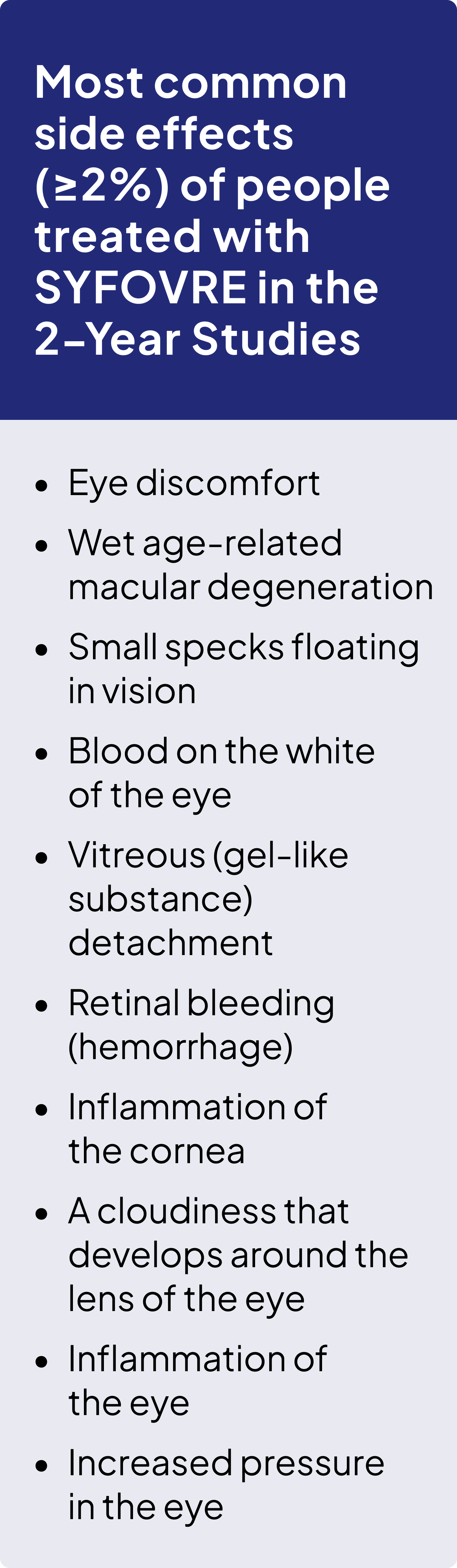 These are not all the possible side effects of SYFOVRE. Tell your healthcare provider about any side effect that bothers you or does not go away.
